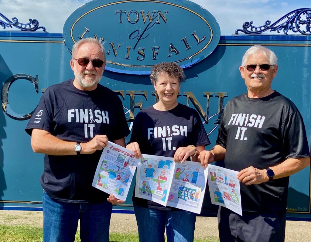 Patrick, Sandy and Bill with a printout of the graphic tale, celebrating the 45th year of the Terry Fox Marathon of Hope.